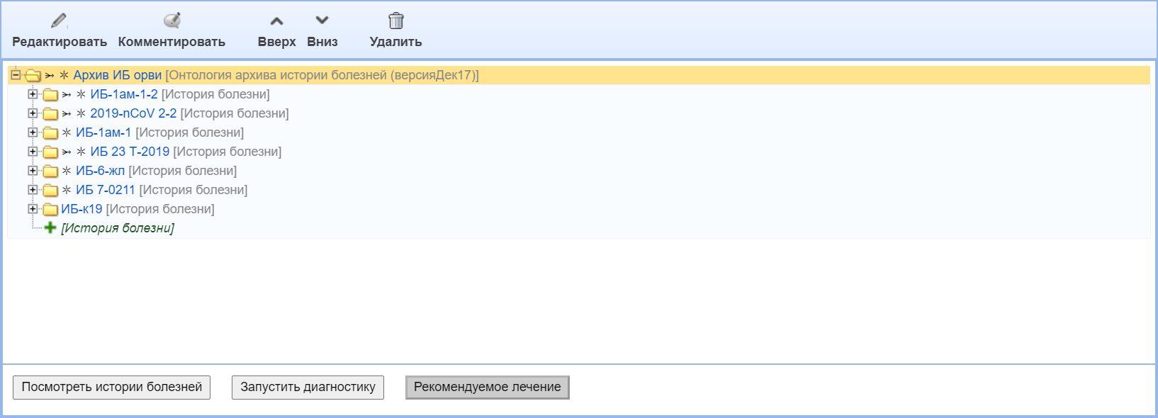 Для запуска диагностики и просмотра ее результата в предложенном «Архиве ИБ» необходимо выбрать или создать новую историю болезни и нажать кнопку «Запустить диагностику» в нижней части экрана.