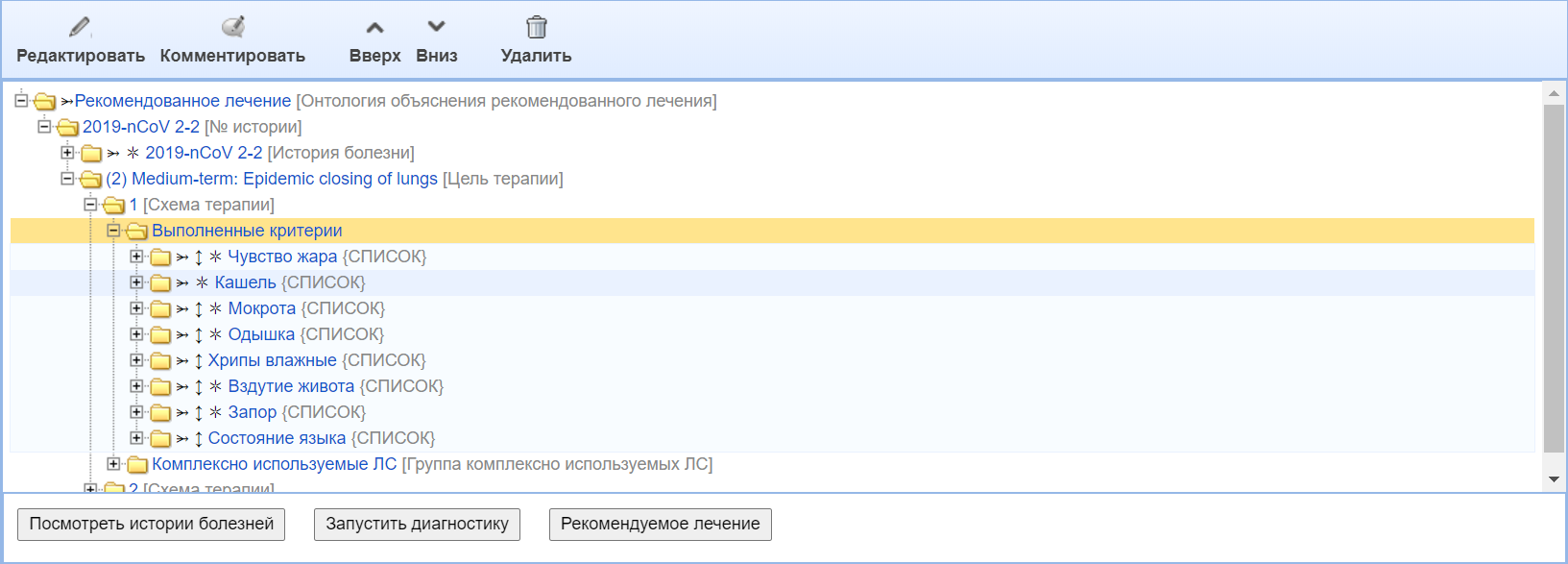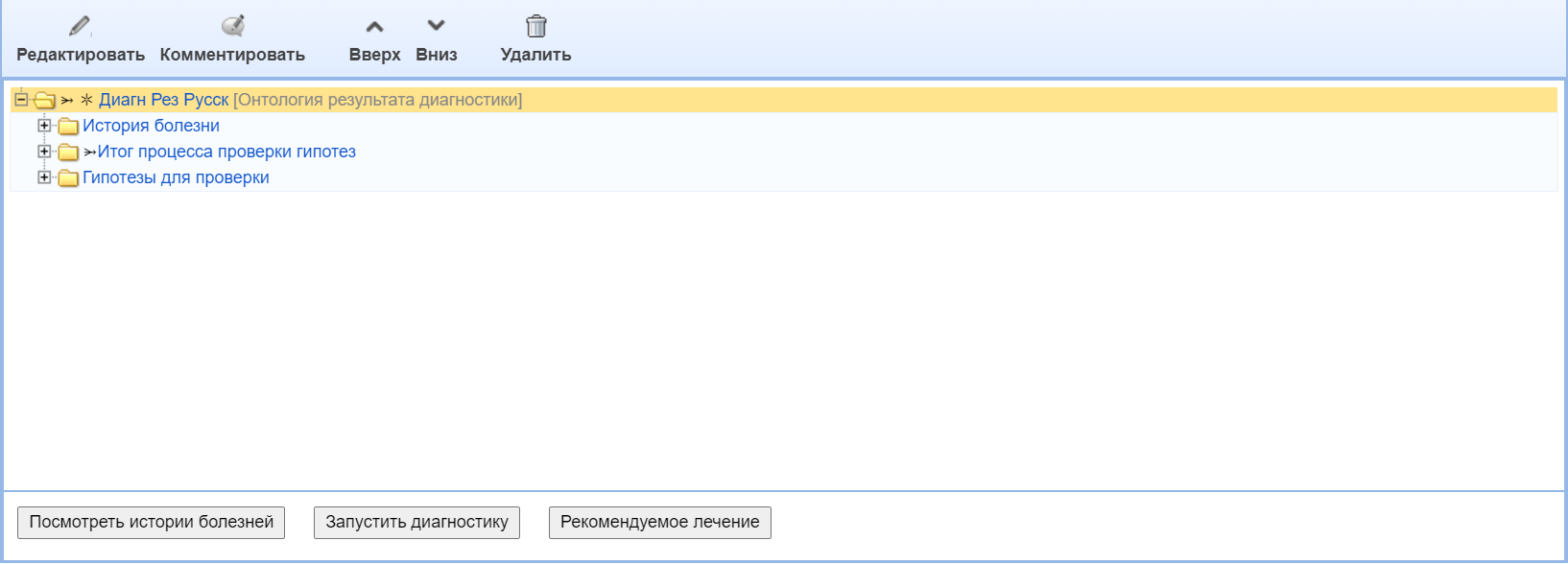 Для просмотра результата процесса поддержки диагностики необходимо открыть (кликнуть) строку «Диагн Рез Рус», затем открыть строку «Итог процесса проверки гипотез». Если предложенная гипотеза заинтересовала, можно открыть строку «Гипотезы для проверки» и прочитать подробное объяснение этой гипотезы.