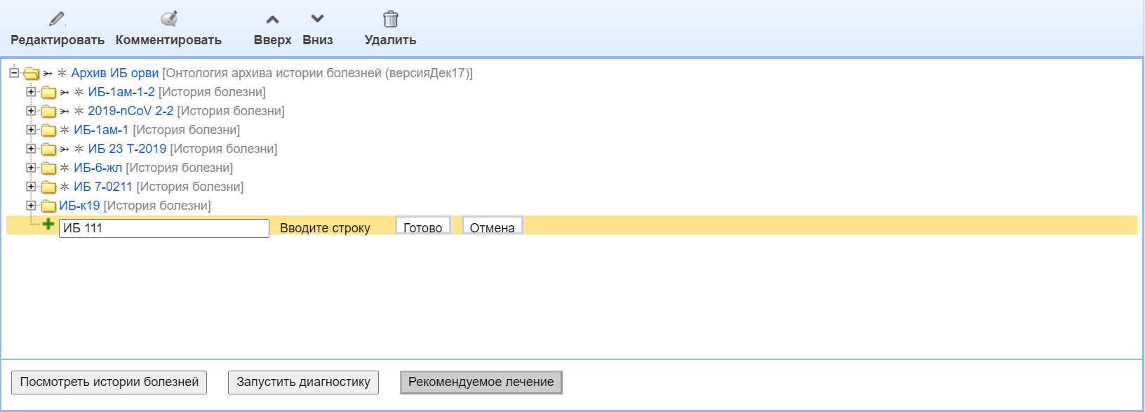 Для создания и проверки новой истории болезни необходимо открыть строку «История болезни» в Архиве ИБ, внести номер или название новой истории (и нажать кнопку «Готово»);