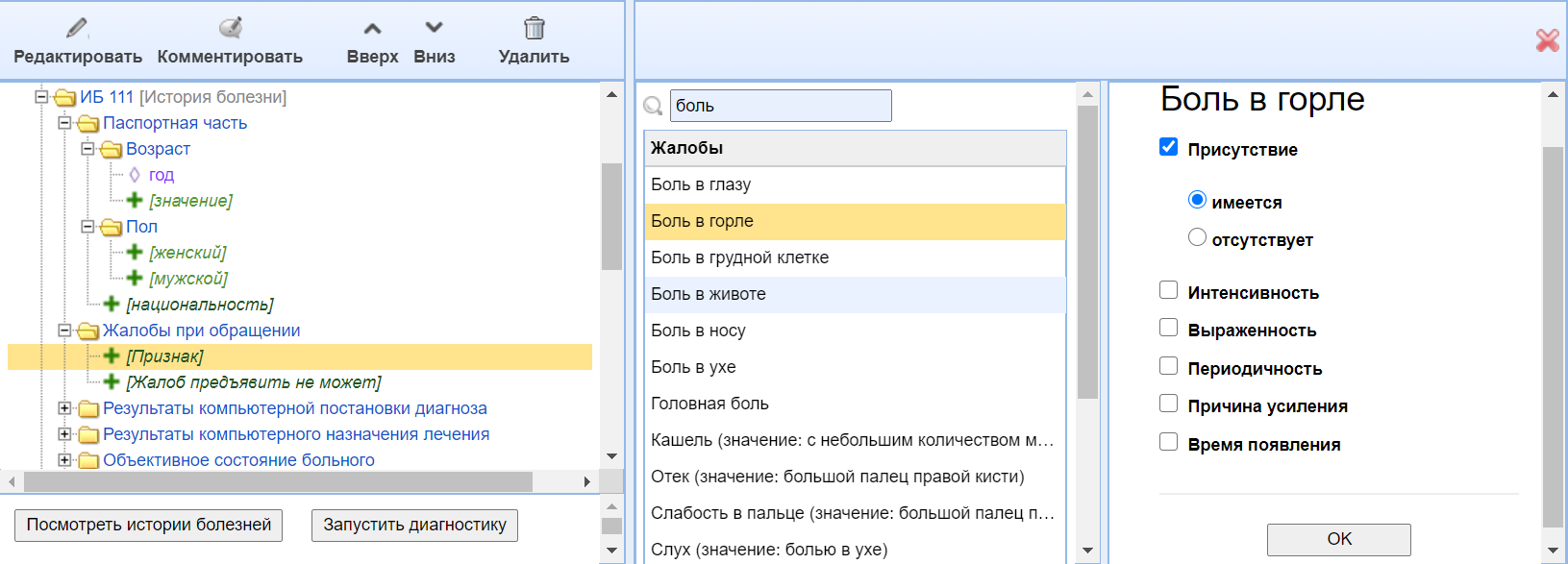 При заполнении полей «Жалобы при обращении» и «Объективное состояние больного» необходимо активировать поле «Признак», внести нужную жалобу (через ее поиск в строке поиска или выбор из списка). В окне с детализированным описанием жалобы выбрать ее необходимые характеристики и значения и нажать кнопку «ОК» в нижней части данного окна.