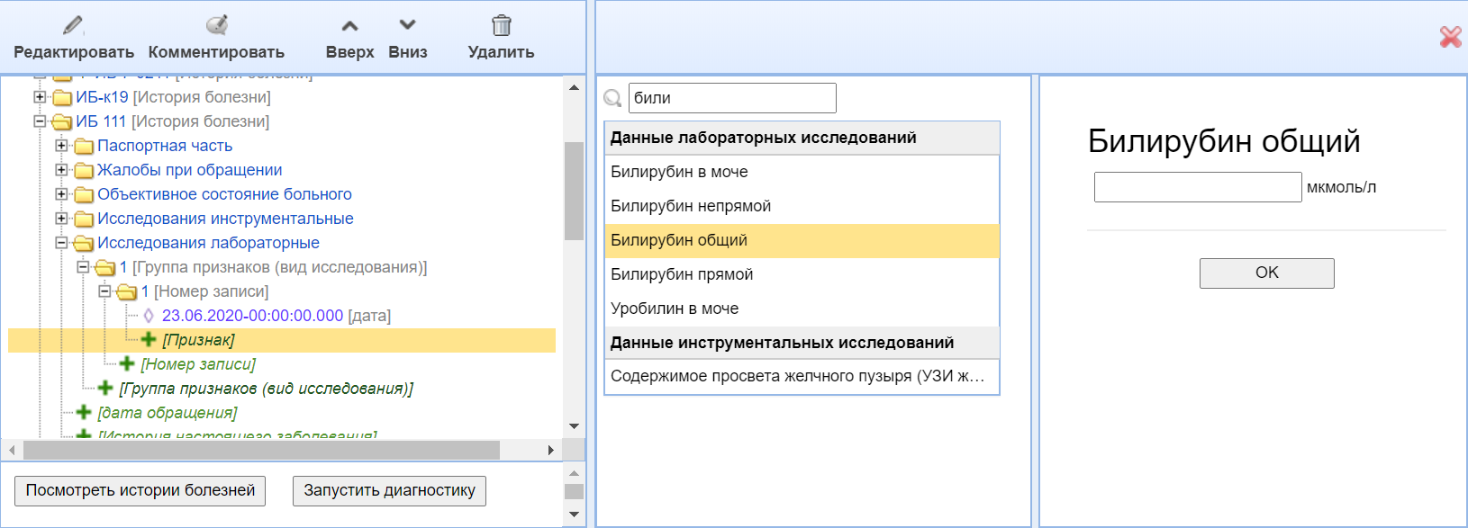 При внесении в Историю Болезни данных лабораторных и инструментальных исследований следует активировать поле «Группа признаков (вид исследования)», внести название исследования или номер, затем внести номер записи и дату исследования. Активировав поле «Признак», выбрать нужное исследование и внести его значение, затем нажать кнопку «ОК»